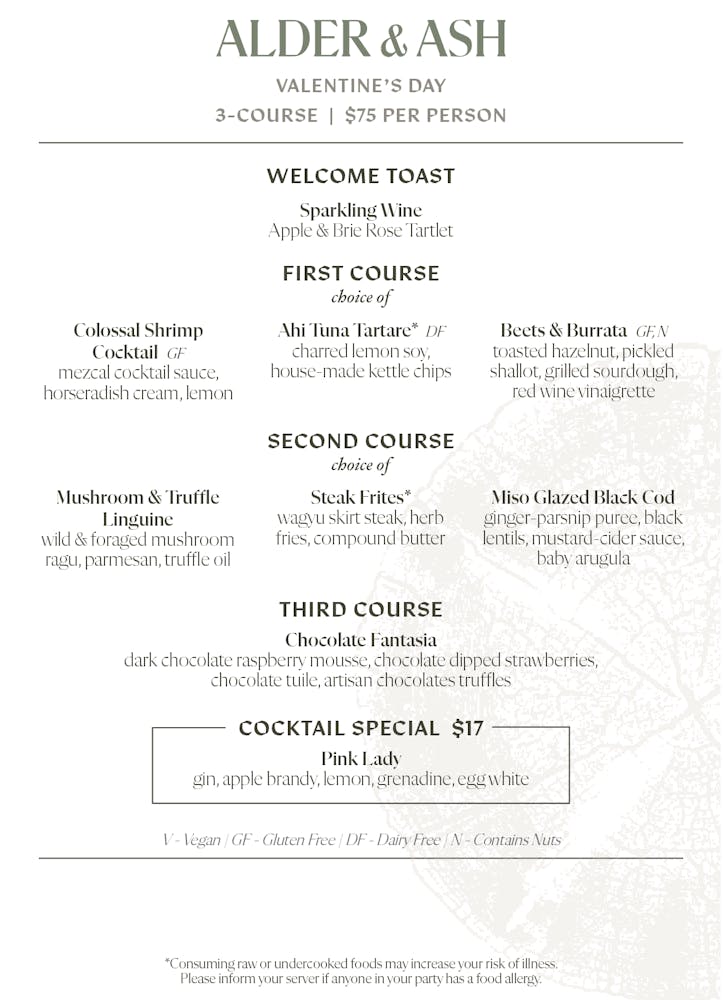 Celebrate Valentine’s Day at Alder & Ash with a special three-course prix fixe menu designed for the occasion. The evening begins with a sparkling wine toast and features a selection of Valentine and signature dishes.